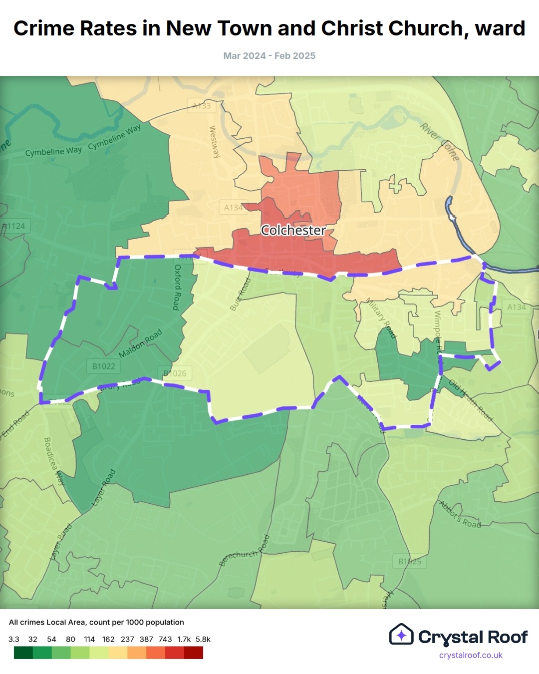 New Town and Christ Church (ward) is located within Colchester (borough). Annual total crime rate in Colchester (borough) is 91.9 crimes per thousand resident population, which can be rated as 4 out of 10 or low crime level compared to other local authority districts in England and Wales.