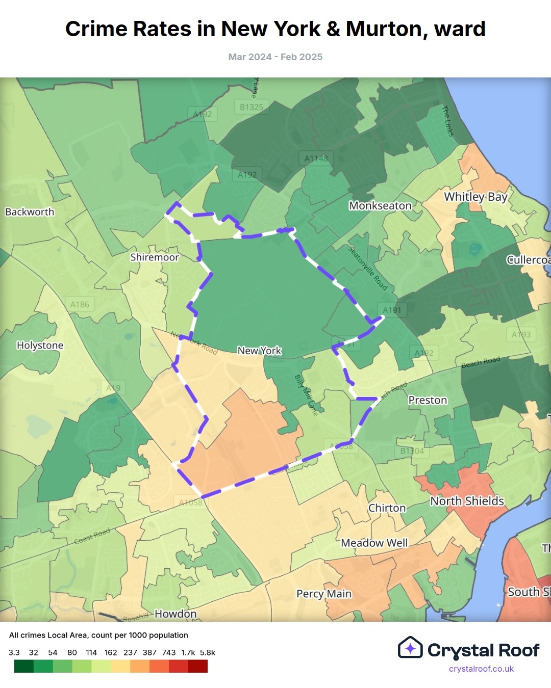 New York & Murton (ward) is located within North Tyneside (borough). Annual total crime rate in North Tyneside (borough) is 105 crimes per thousand resident population, which can be rated as 5 out of 10 or medium crime level compared to other local authority districts in England and Wales.