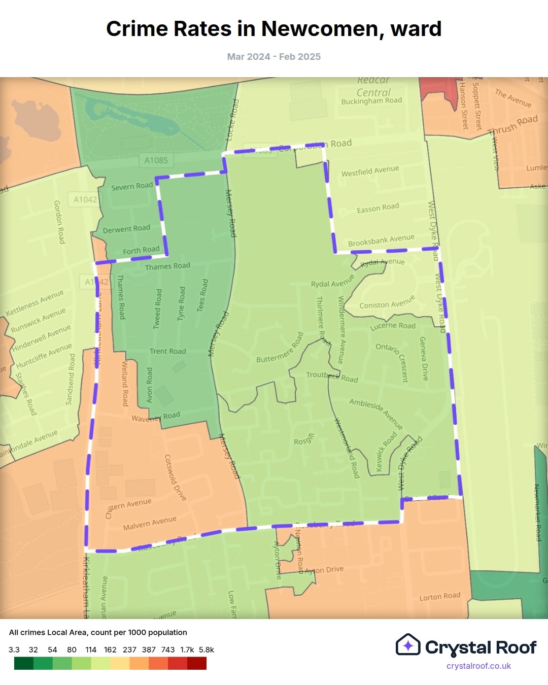 Newcomen (ward) is located within Redcar and Cleveland (borough). Annual total crime rate in Redcar and Cleveland (borough) is 139 crimes per thousand resident population, which can be rated as 7 out of 10 or high crime level compared to other local authority districts in England and Wales.