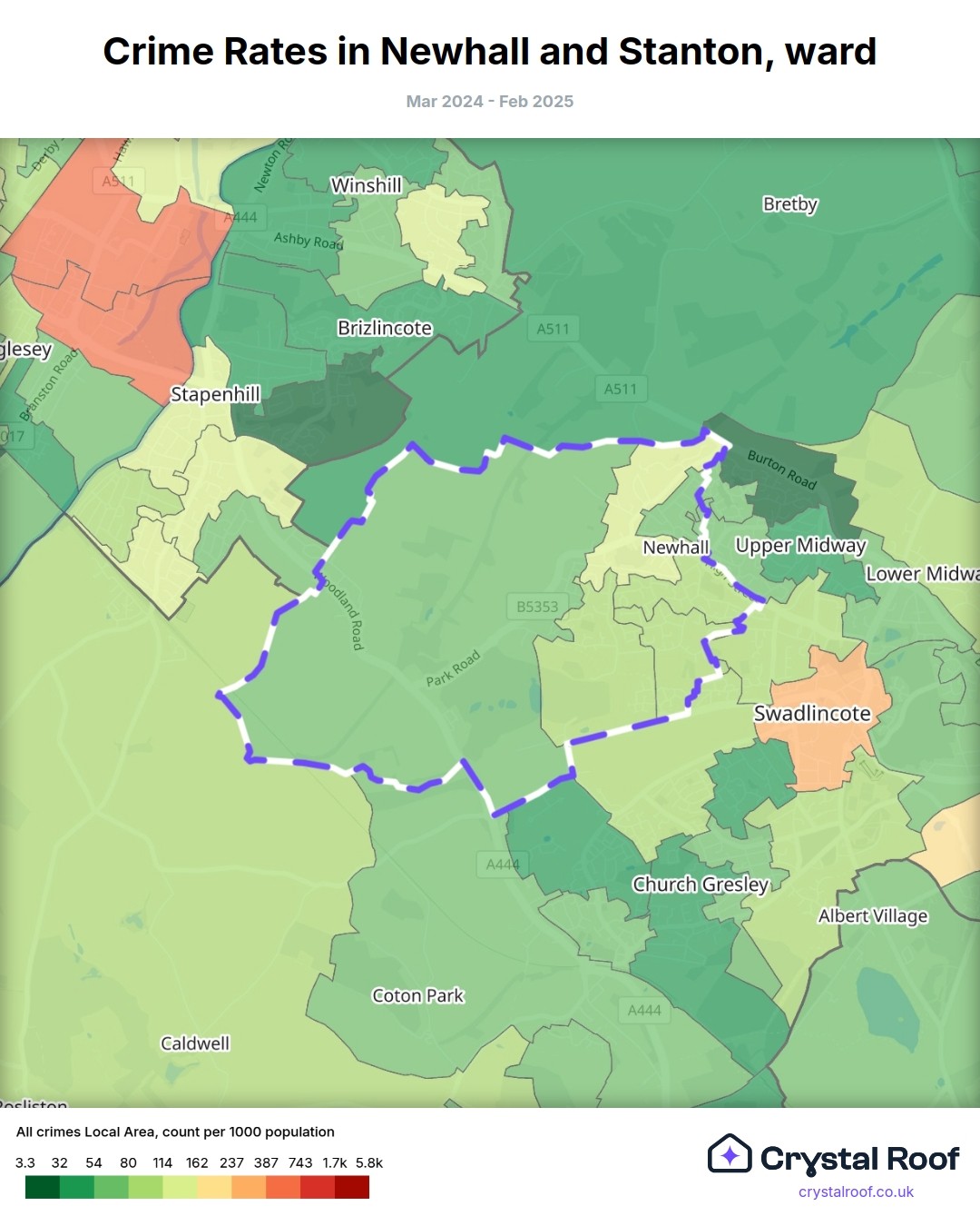 Newhall and Stanton (ward) is located within South Derbyshire (borough). Annual total crime rate in South Derbyshire (borough) is 70.9 crimes per thousand resident population, which can be rated as 2 out of 10 or low crime level compared to other local authority districts in England and Wales.