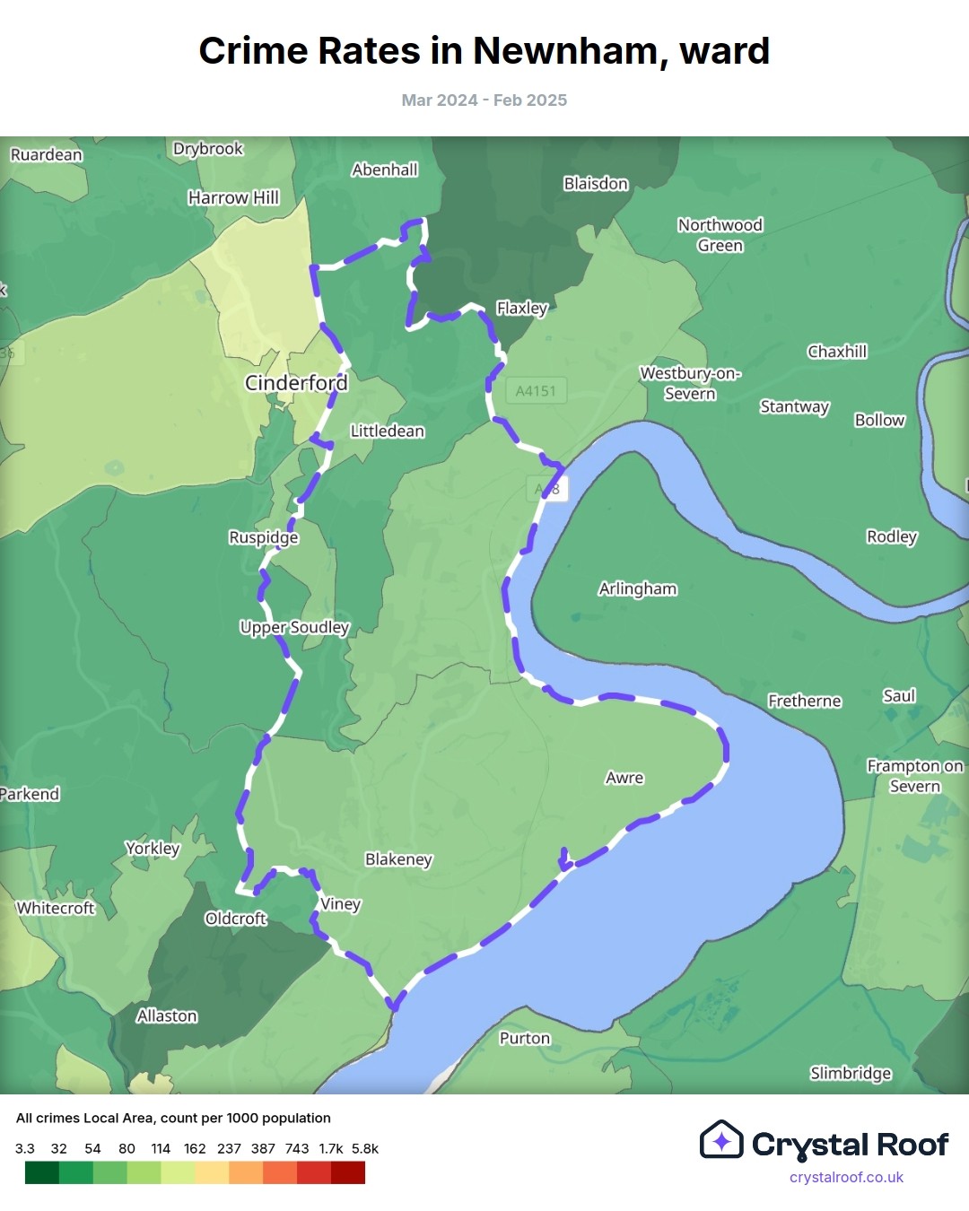 Newnham (ward) is located within Forest of Dean (borough). Annual total crime rate in Forest of Dean (borough) is 67.2 crimes per thousand resident population, which can be rated as 2 out of 10 or low crime level compared to other local authority districts in England and Wales.