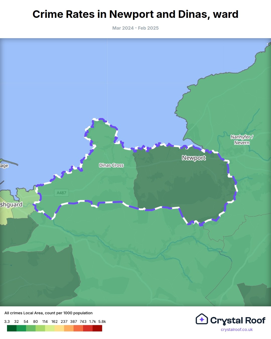 Newport and Dinas (ward) is located within Pembrokeshire (borough). Annual total crime rate in Pembrokeshire (borough) is 85 crimes per thousand resident population, which can be rated as 3 out of 10 or low crime level compared to other local authority districts in England and Wales.