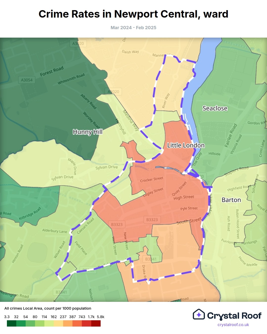 Newport Central, (ward) includes areas with the following crime ratings (see map):