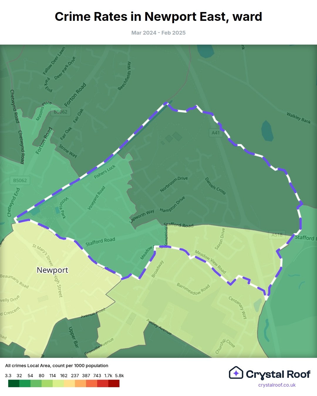 Newport East (ward) is located within Telford and Wrekin (borough). Annual total crime rate in Telford and Wrekin (borough) is 98.1 crimes per thousand resident population, which can be rated as 4 out of 10 or low crime level compared to other local authority districts in England and Wales.