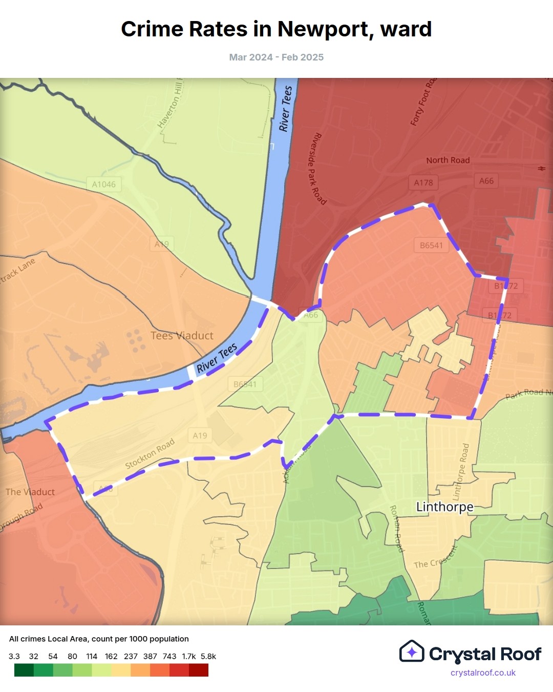 Newport (ward) is located within Middlesbrough (borough). Annual total crime rate in Middlesbrough (borough) is 194 crimes per thousand resident population, which can be rated as 8 out of 10 or high crime level compared to other local authority districts in England and Wales.