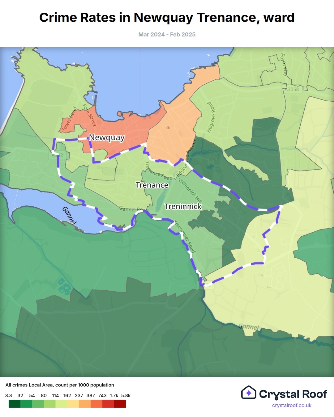 The figures in grey indicate the relative ratings of Newquay Trenance (ward) for a specific crime type compared to other wards in England and Wales.