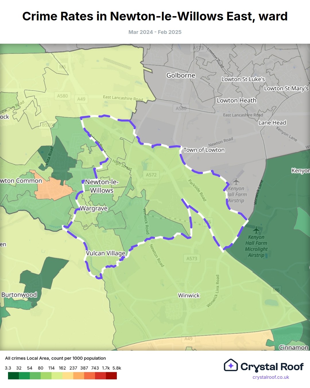 Newton-le-Willows East, (ward) includes areas with the following crime ratings (see map):