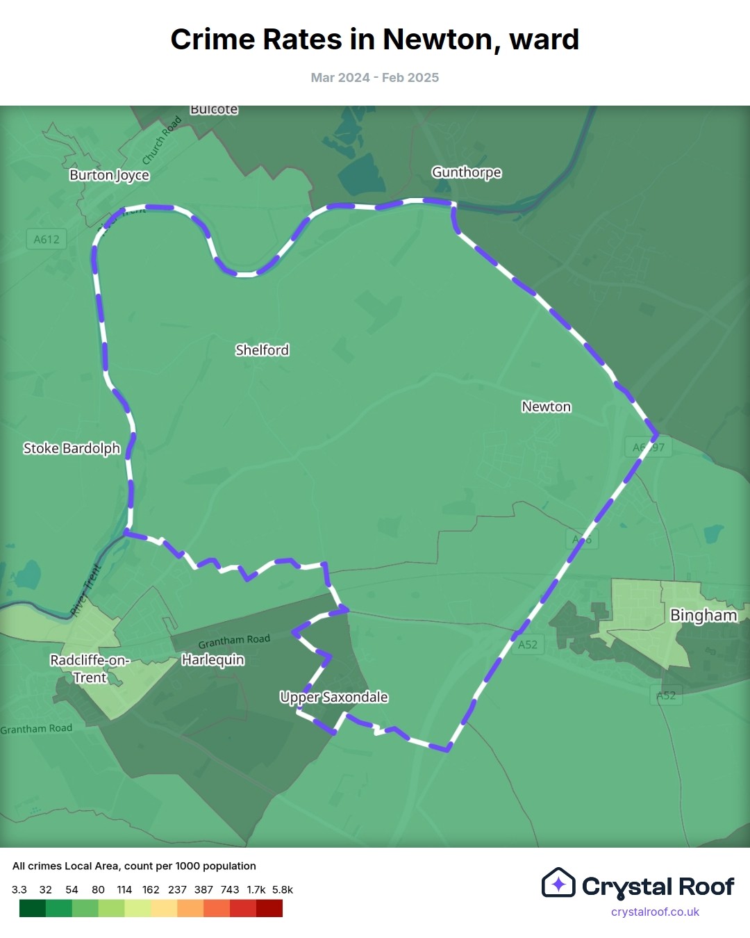 Newton (ward) is located within Rushcliffe (borough). Annual total crime rate in Rushcliffe (borough) is 52.6 crimes per thousand resident population, which can be rated as 1 out of 10 or low crime level compared to other local authority districts in England and Wales.
