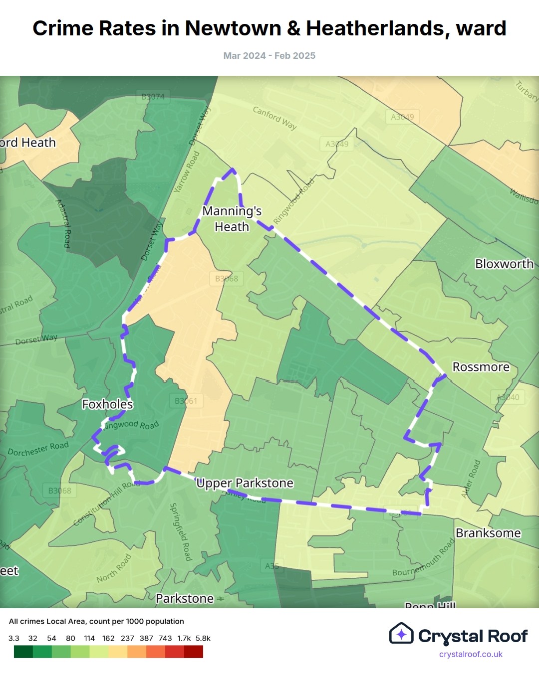 Newtown & Heatherlands, (ward) includes areas with the following crime ratings (see map):