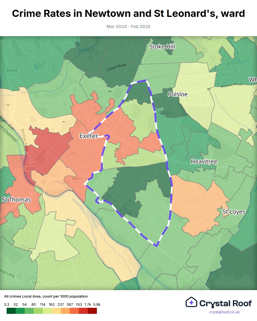 Newtown and St Leonard's (ward) is located within Exeter (borough). Annual total crime rate in Exeter (borough) is 121 crimes per thousand resident population, which can be rated as 6 out of 10 or medium crime level compared to other local authority districts in England and Wales.