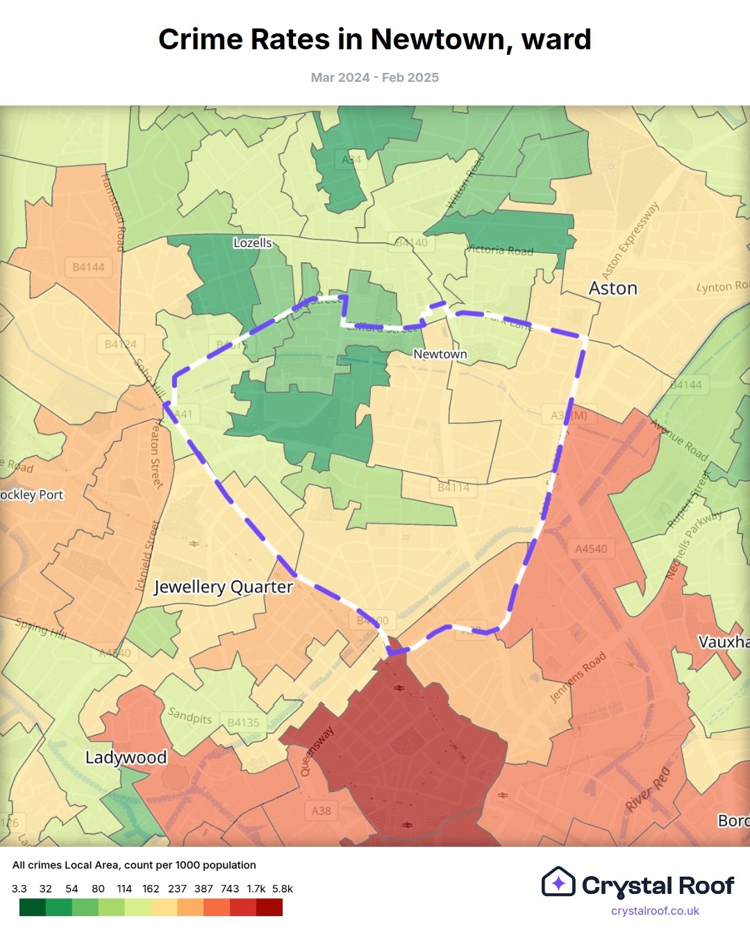 Newtown (ward) is located within Birmingham (borough). Annual total crime rate in Birmingham (borough) is 129 crimes per thousand resident population, which can be rated as 6 out of 10 or medium crime level compared to other local authority districts in England and Wales.