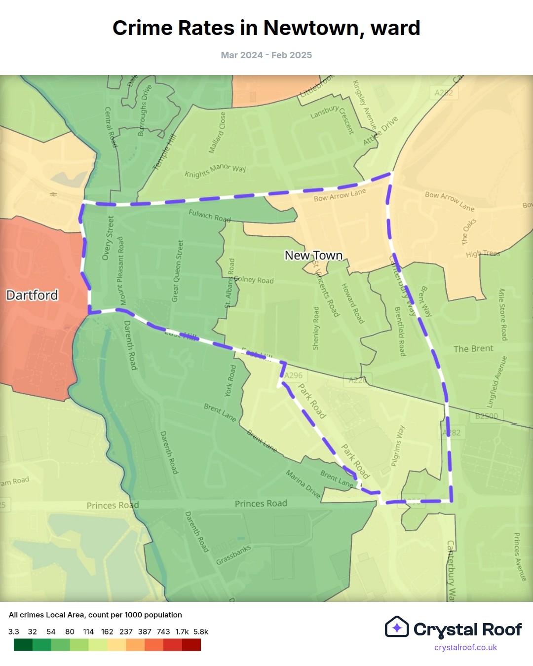 Newtown (ward) is located within Dartford (borough). Annual total crime rate in Dartford (borough) is 118 crimes per thousand resident population, which can be rated as 6 out of 10 or medium crime level compared to other local authority districts in England and Wales.