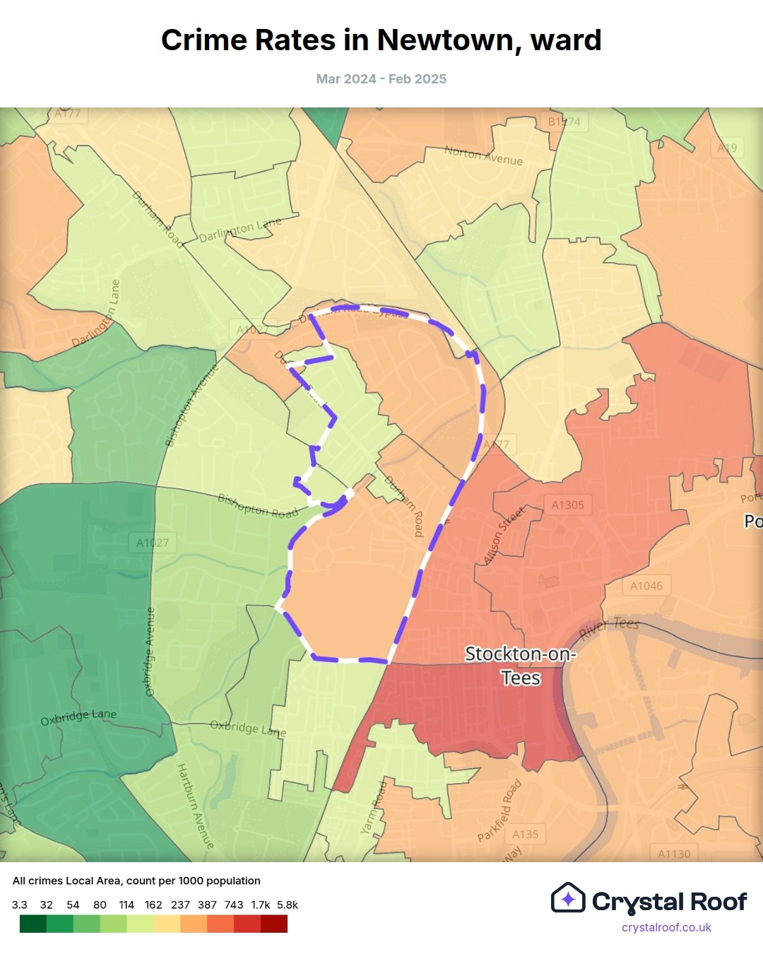 Newtown (ward) is located within Stockton-on-Tees (borough). Annual total crime rate in Stockton-on-Tees (borough) is 129 crimes per thousand resident population, which can be rated as 6 out of 10 or medium crime level compared to other local authority districts in England and Wales.