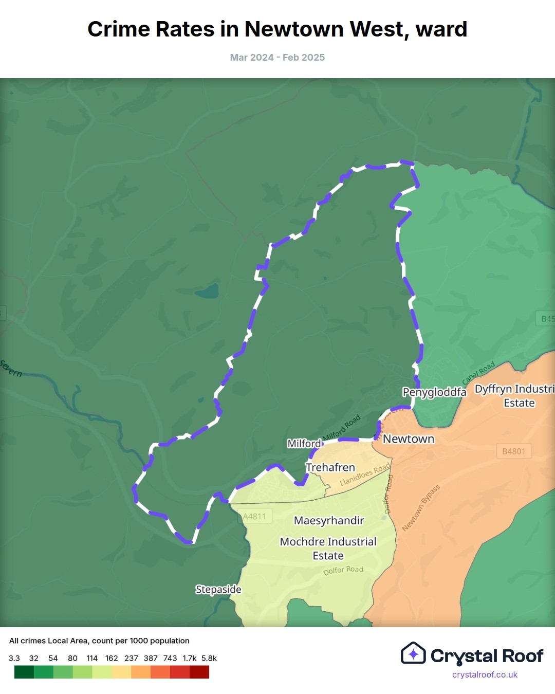 Newtown West (ward) is located within Powys (borough). Annual total crime rate in Powys (borough) is 66.8 crimes per thousand resident population, which can be rated as 2 out of 10 or low crime level compared to other local authority districts in England and Wales.