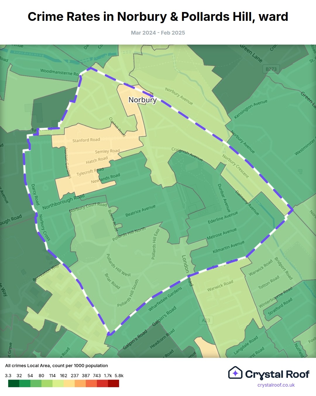 Norbury & Pollards Hill, (ward) includes areas with the following crime ratings (see map):