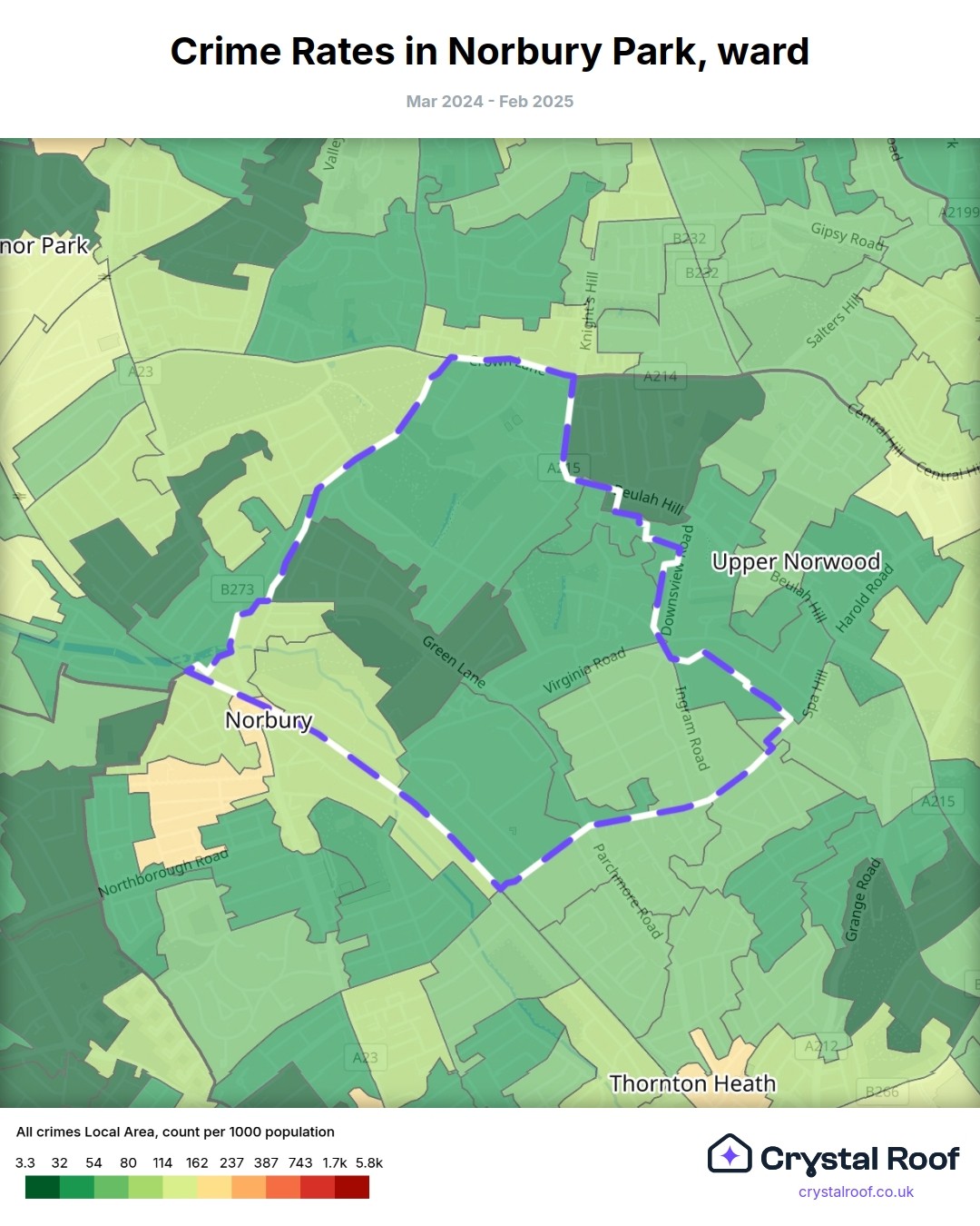The figures in grey indicate the relative ratings of Norbury Park (ward) for a specific crime type compared to other wards in England and Wales.