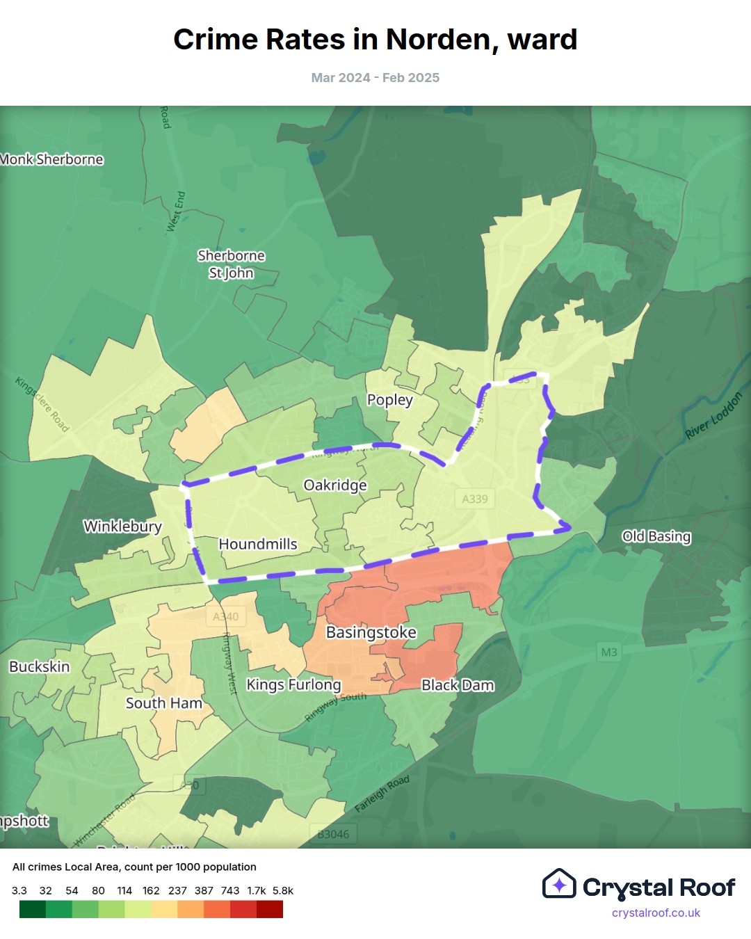 Norden (ward) is located within Basingstoke and Deane (borough). Annual total crime rate in Basingstoke and Deane (borough) is 74.1 crimes per thousand resident population, which can be rated as 3 out of 10 or low crime level compared to other local authority districts in England and Wales.