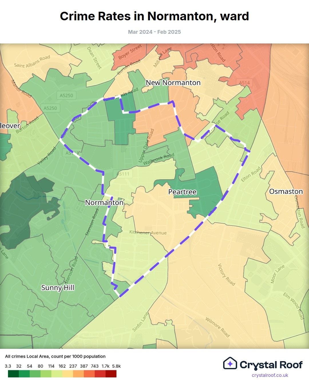 Normanton (ward) is located within Derby (borough). Annual total crime rate in Derby (borough) is 136 crimes per thousand resident population, which can be rated as 7 out of 10 or high crime level compared to other local authority districts in England and Wales.