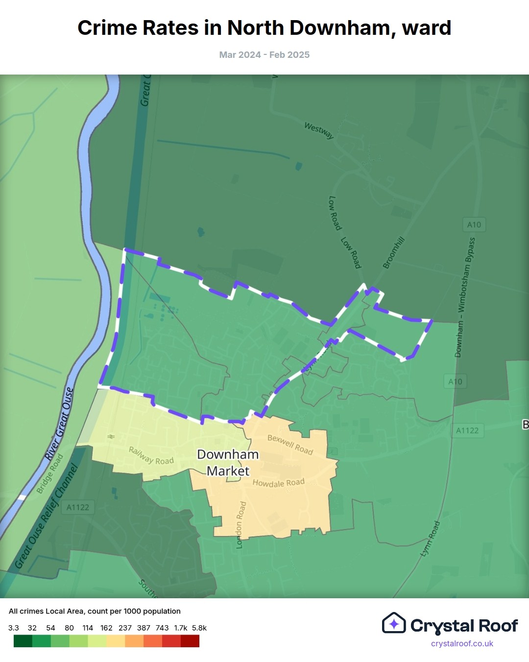 North Downham, (ward) includes areas with the following crime ratings (see map):