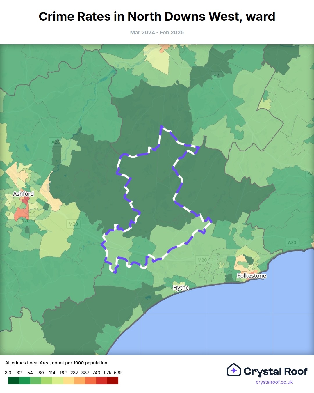North Downs West, (ward) includes areas with the following crime ratings (see map):