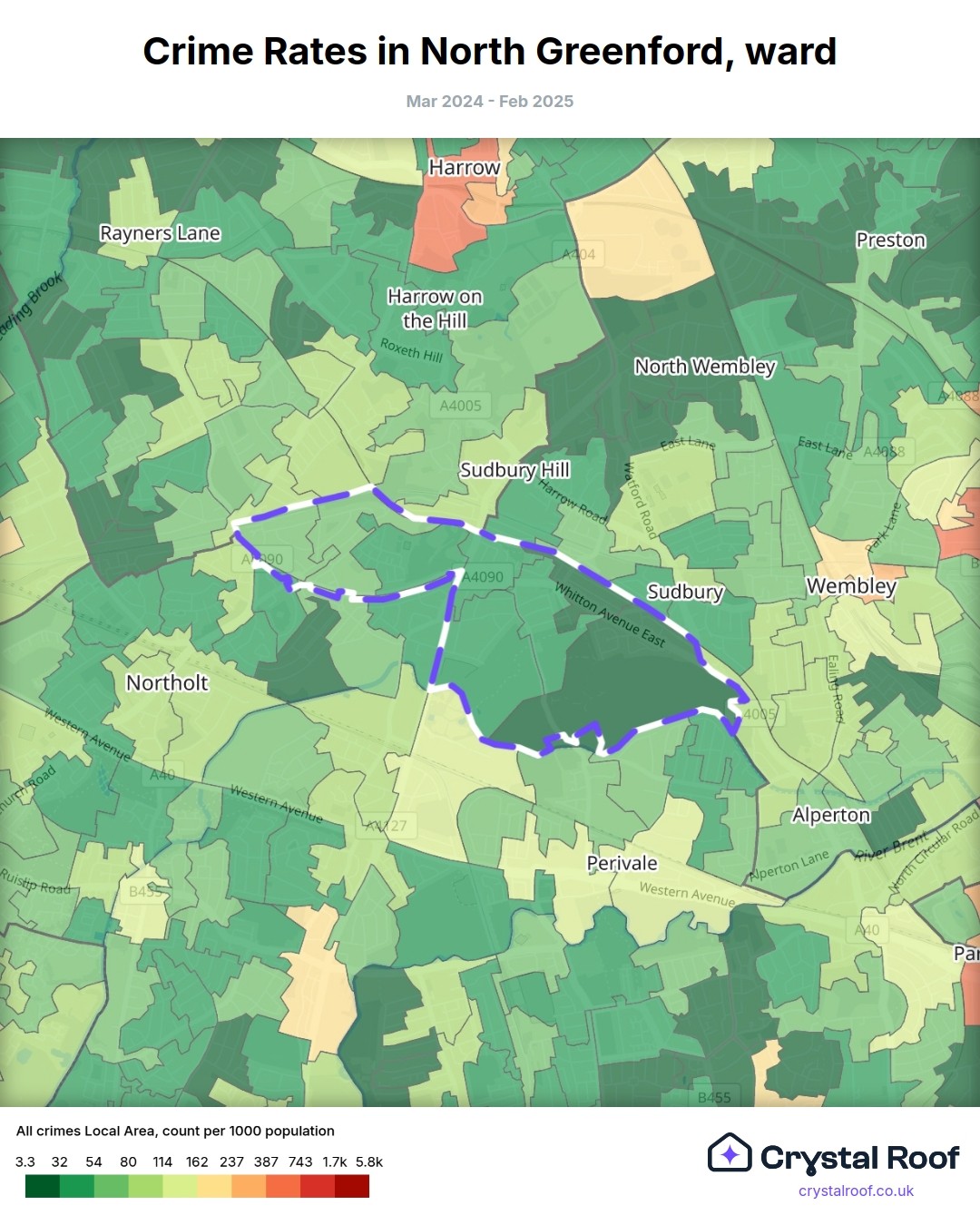 The figures in grey indicate the relative ratings of North Greenford (ward) for a specific crime type compared to other wards in England and Wales.