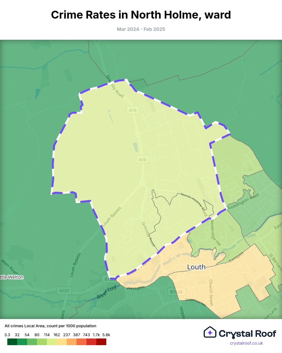 North Holme (ward) is located within East Lindsey (borough). Annual total crime rate in East Lindsey (borough) is 93 crimes per thousand resident population, which can be rated as 4 out of 10 or low crime level compared to other local authority districts in England and Wales.