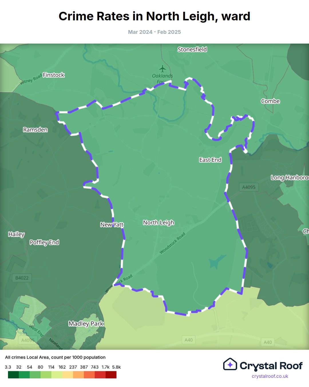 The figures in grey indicate the relative ratings of North Leigh (ward) for a specific crime type compared to other wards in England and Wales.