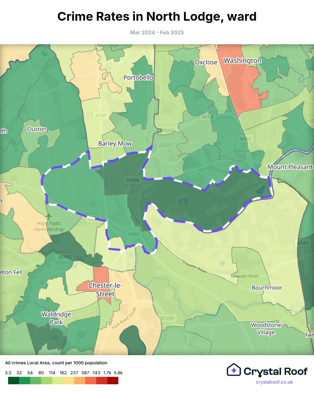 The figures in grey indicate the relative ratings of North Lodge (ward) for a specific crime type compared to other wards in England and Wales.