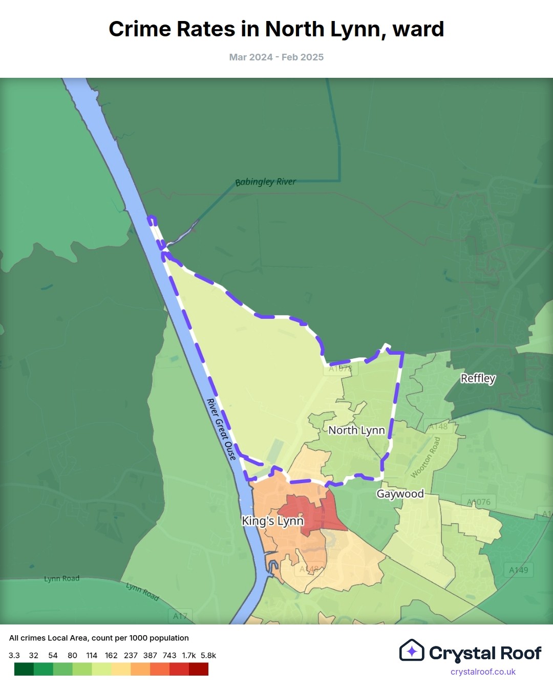 The figures in grey indicate the relative ratings of North Lynn (ward) for a specific crime type compared to other wards in England and Wales.