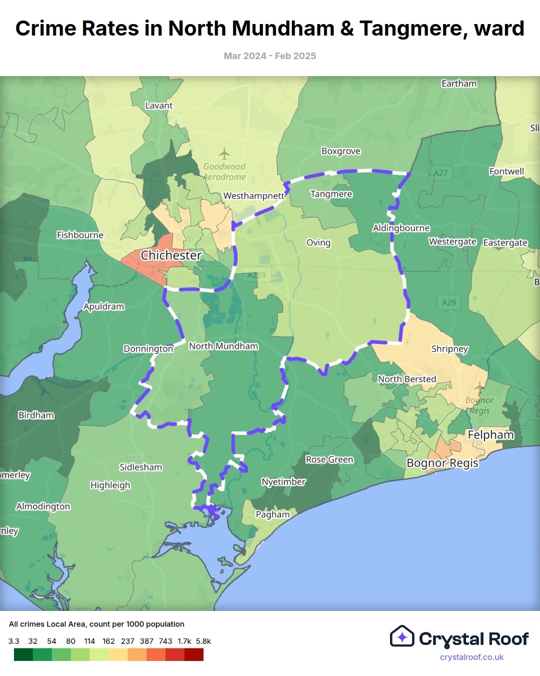 North Mundham & Tangmere, (ward) includes areas with the following crime ratings (see map):