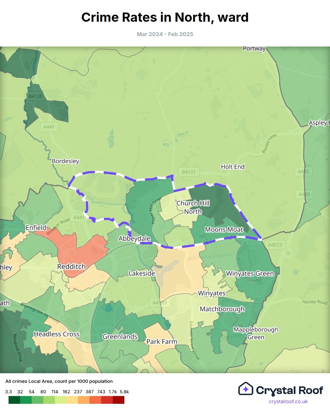 North (ward) is located within Redditch (borough). Annual total crime rate in Redditch (borough) is 88.8 crimes per thousand resident population, which can be rated as 4 out of 10 or low crime level compared to other local authority districts in England and Wales.