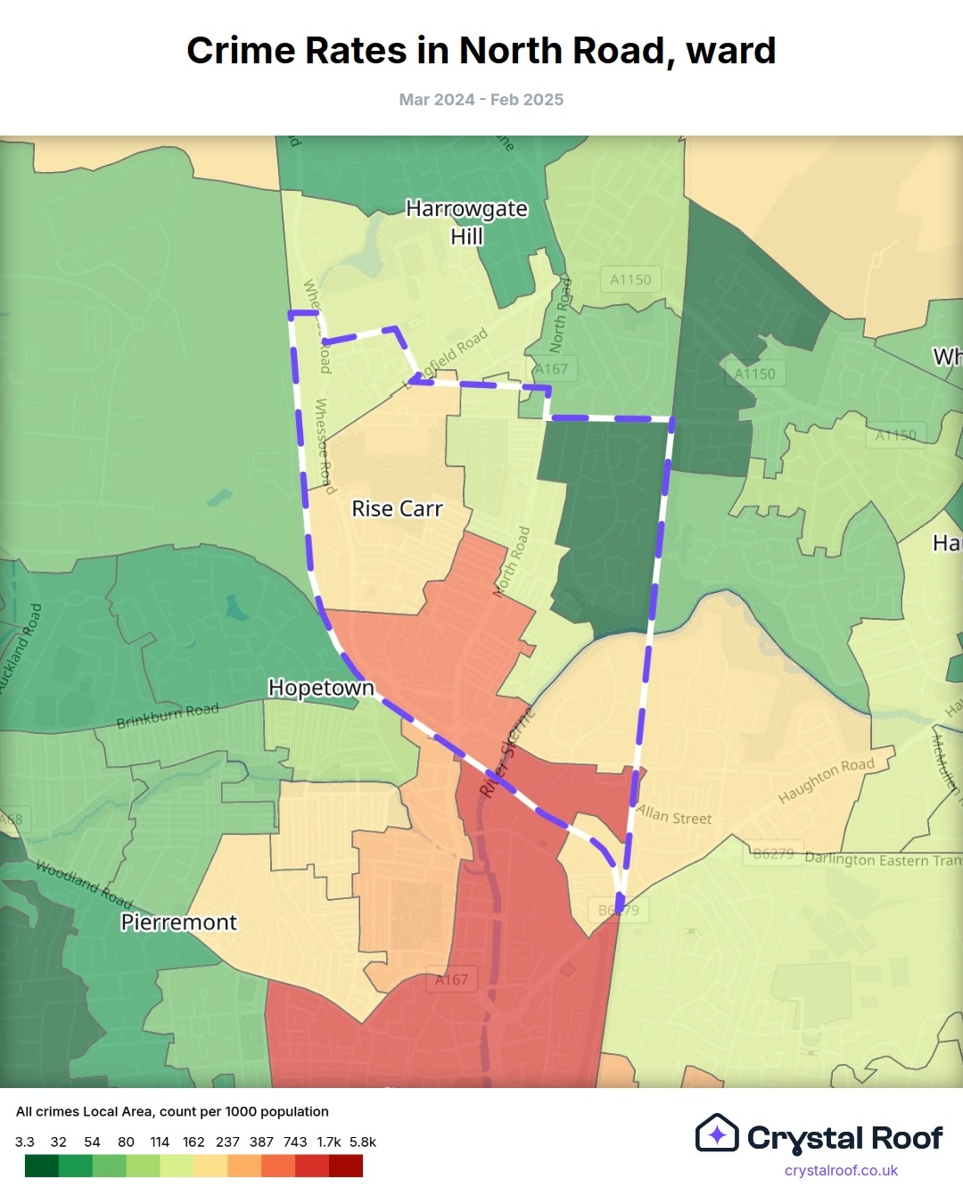 North Road (ward) is located within Darlington (borough). Annual total crime rate in Darlington (borough) is 112 crimes per thousand resident population, which can be rated as 5 out of 10 or medium crime level compared to other local authority districts in England and Wales.