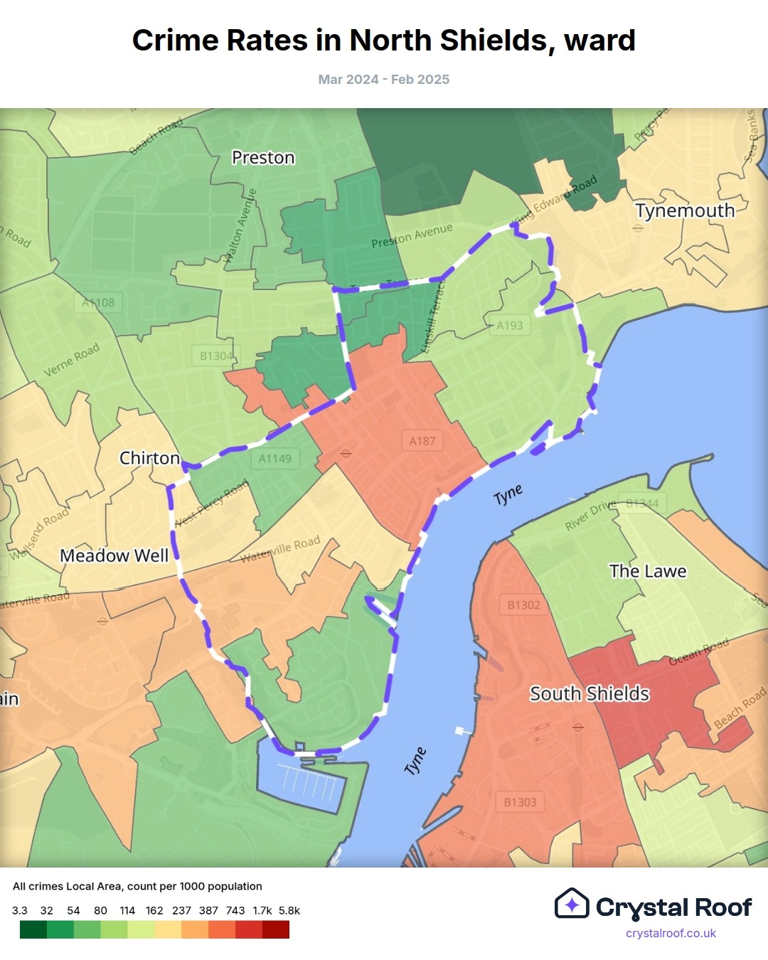 North Shields, (ward) includes areas with the following crime ratings (see map):