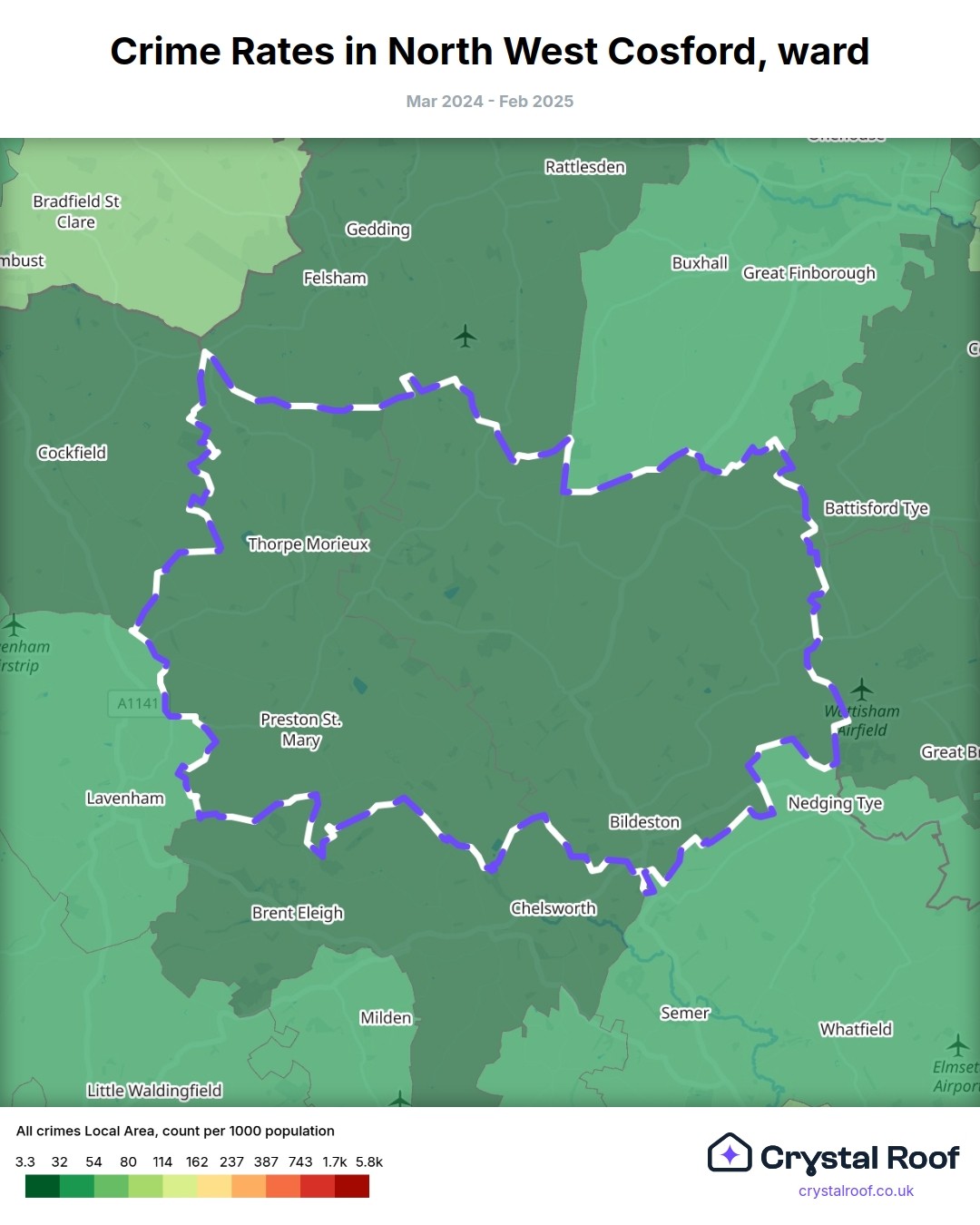 North West Cosford (ward) is located within Babergh (borough). Annual total crime rate in Babergh (borough) is 47.2 crimes per thousand resident population, which can be rated as 1 out of 10 or low crime level compared to other local authority districts in England and Wales.