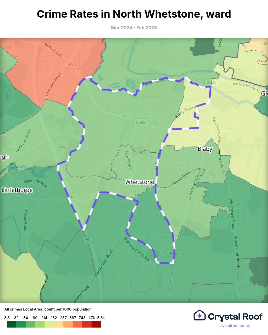North Whetstone (ward) is located within Blaby (borough). Annual total crime rate in Blaby (borough) is 72 crimes per thousand resident population, which can be rated as 2 out of 10 or low crime level compared to other local authority districts in England and Wales.