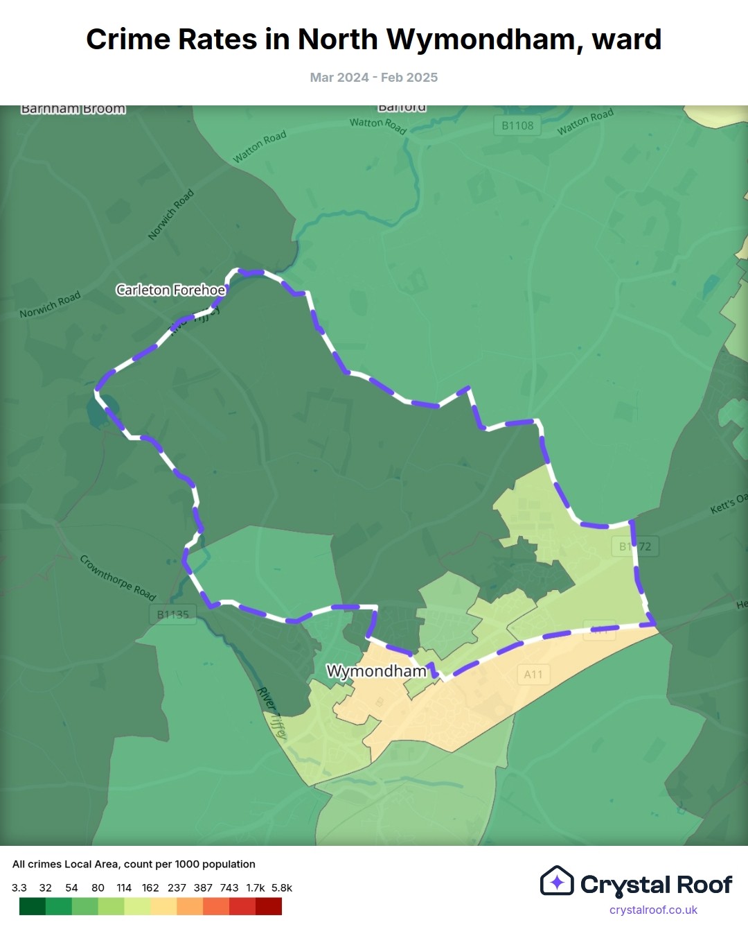 North Wymondham, (ward) includes areas with the following crime ratings (see map):
