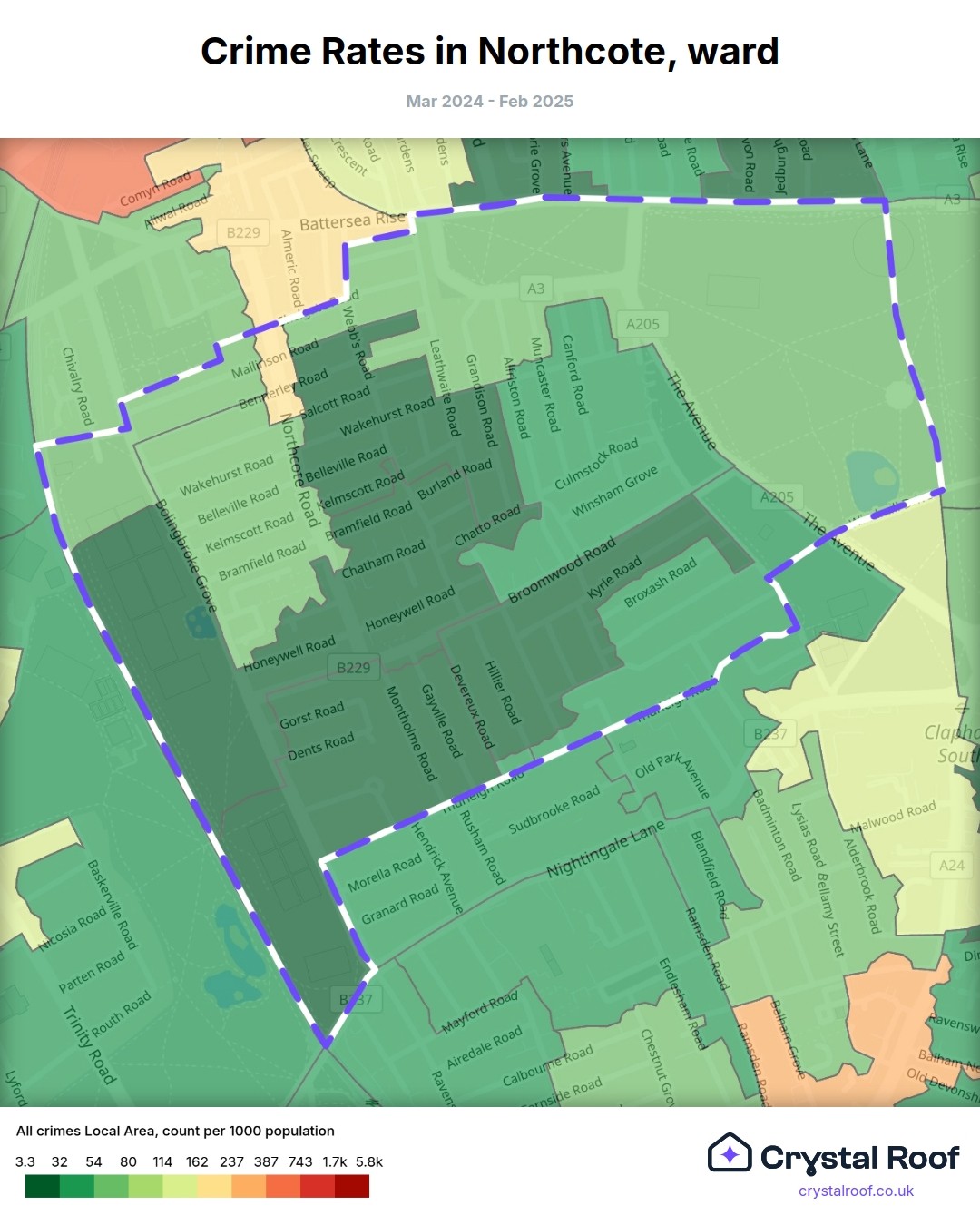 Northcote (ward) is located within Wandsworth (borough). Annual total crime rate in Wandsworth (borough) is 103 crimes per thousand resident population, which can be rated as 5 out of 10 or medium crime level compared to other local authority districts in England and Wales.