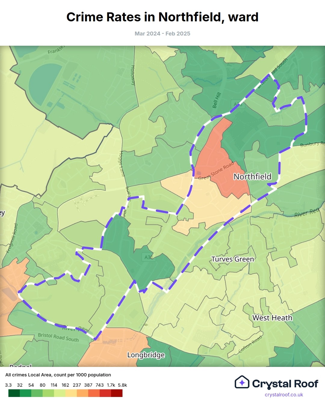 The figures in grey indicate the relative ratings of Northfield (ward) for a specific crime type compared to other wards in England and Wales.