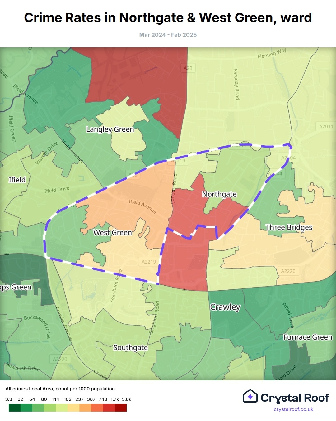 Northgate & West Green (ward) is located within Crawley (borough). Annual total crime rate in Crawley (borough) is 124 crimes per thousand resident population, which can be rated as 6 out of 10 or medium crime level compared to other local authority districts in England and Wales.