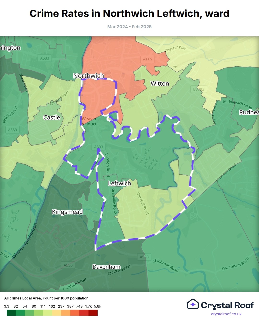 Northwich Leftwich, (ward) includes areas with the following crime ratings (see map):