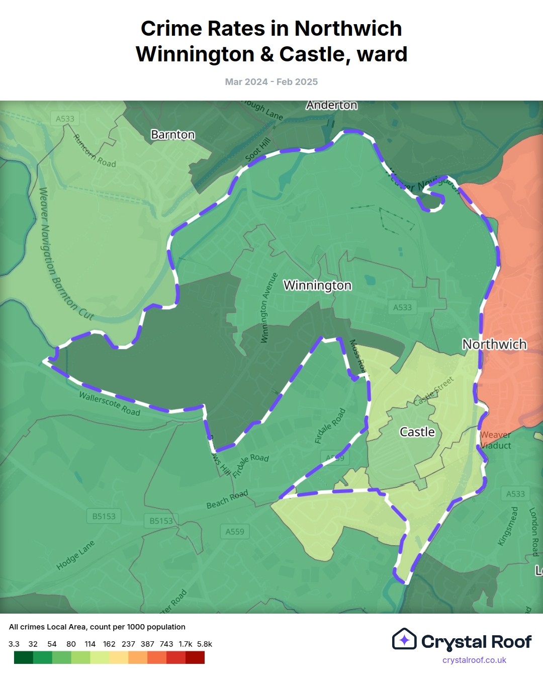 The figures in grey indicate the relative ratings of Northwich Winnington & Castle (ward) for a specific crime type compared to other wards in England and Wales.