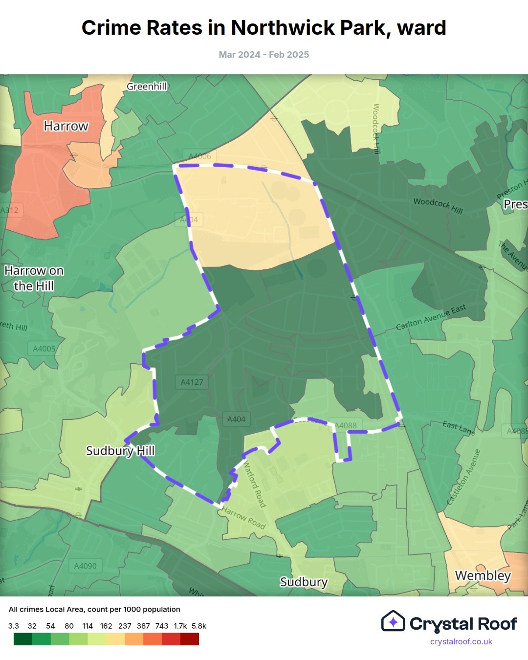 The figures in grey indicate the relative ratings of Northwick Park (ward) for a specific crime type compared to other wards in England and Wales.