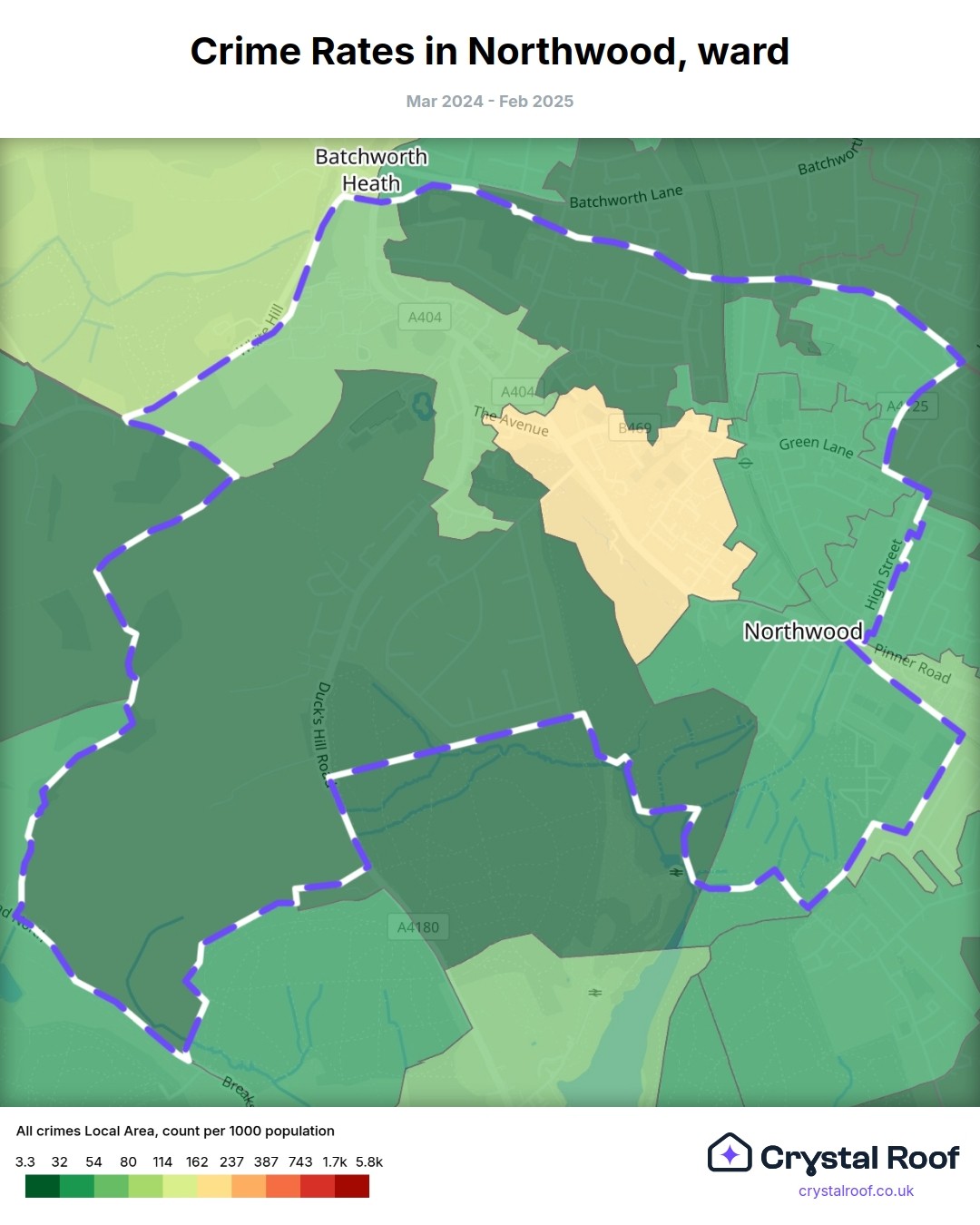 The figures in grey indicate the relative ratings of Northwood (ward) for a specific crime type compared to other wards in England and Wales.