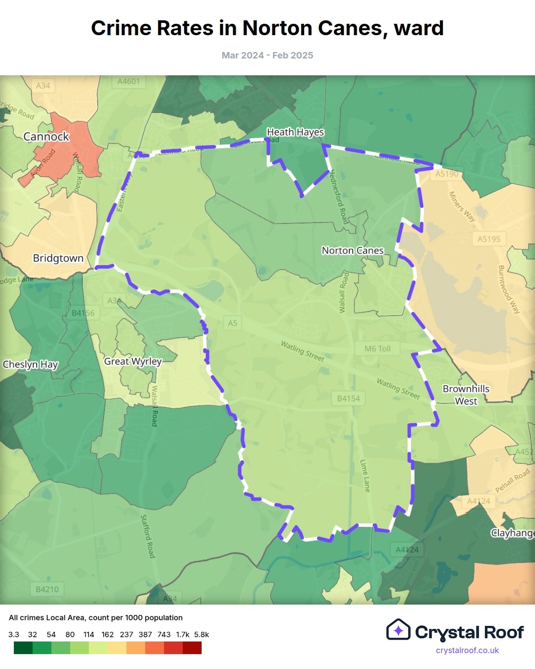 Norton Canes (ward) is located within Cannock Chase (borough). Annual total crime rate in Cannock Chase (borough) is 86.2 crimes per thousand resident population, which can be rated as 4 out of 10 or low crime level compared to other local authority districts in England and Wales.
