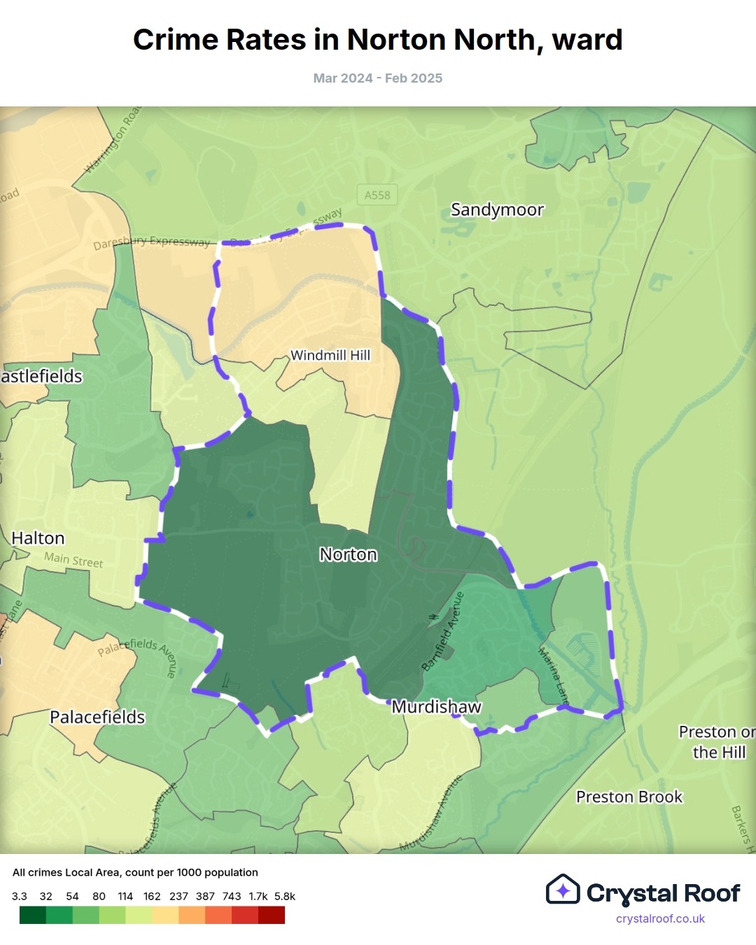 Norton North (ward) is located within Halton (borough). Annual total crime rate in Halton (borough) is 91.4 crimes per thousand resident population, which can be rated as 4 out of 10 or low crime level compared to other local authority districts in England and Wales.