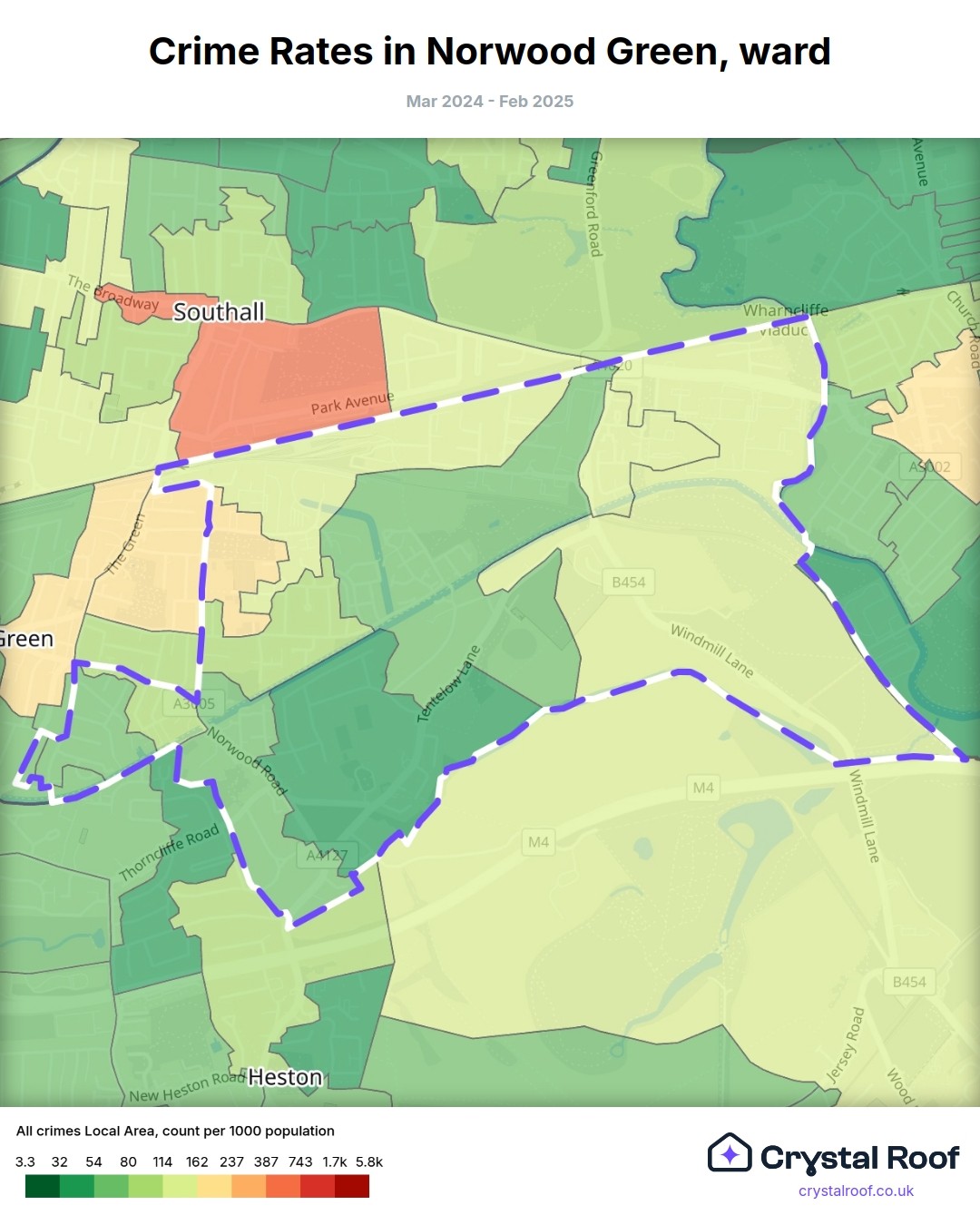 The figures in grey indicate the relative ratings of Norwood Green (ward) for a specific crime type compared to other wards in England and Wales.