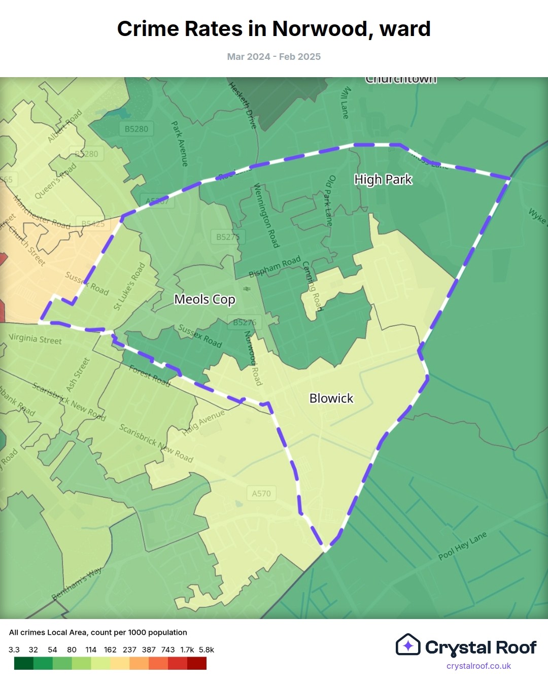 Norwood (ward) is located within Sefton (borough). Annual total crime rate in Sefton (borough) is 86.3 crimes per thousand resident population, which can be rated as 4 out of 10 or low crime level compared to other local authority districts in England and Wales.