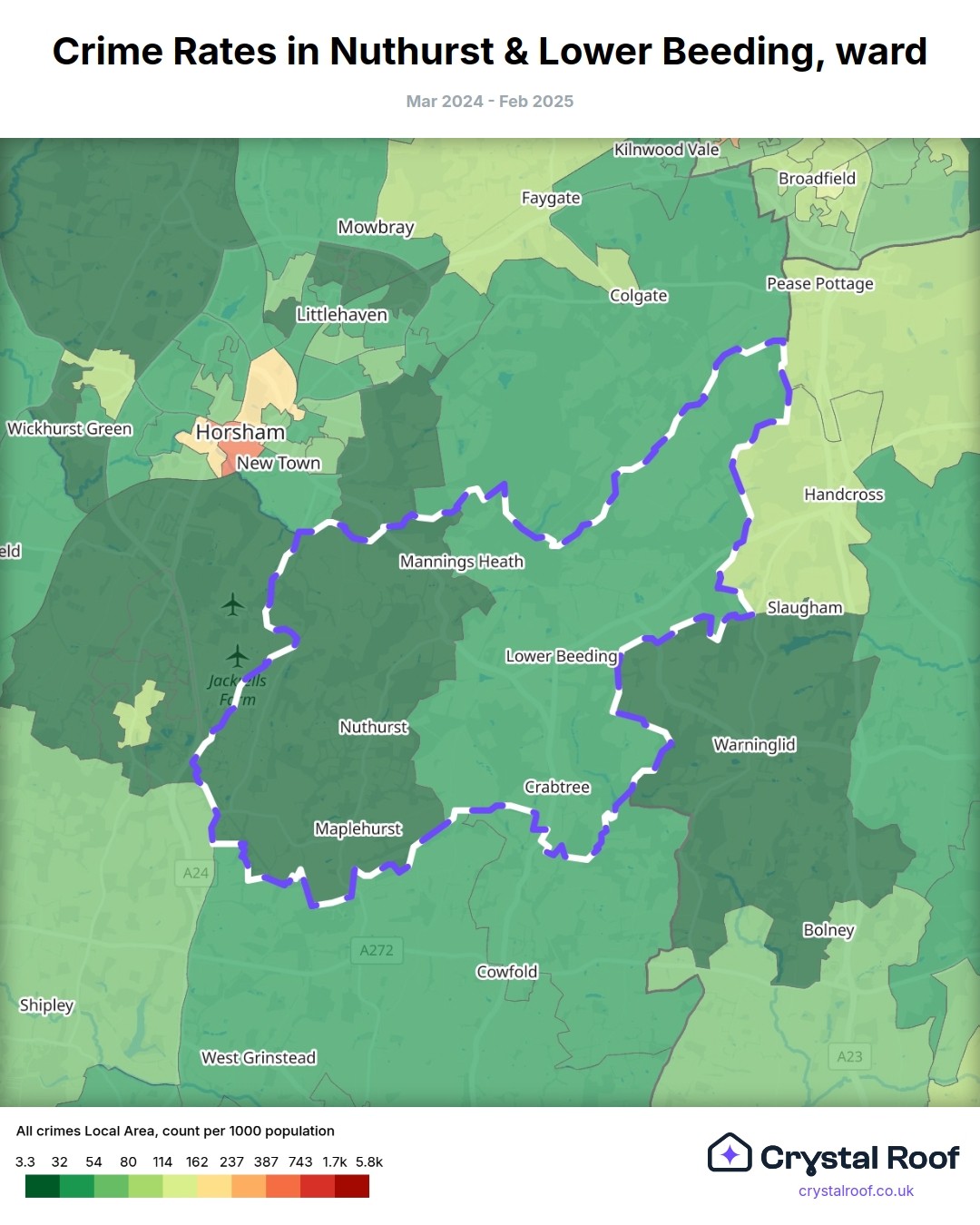 Nuthurst & Lower Beeding, (ward) includes areas with the following crime ratings (see map):