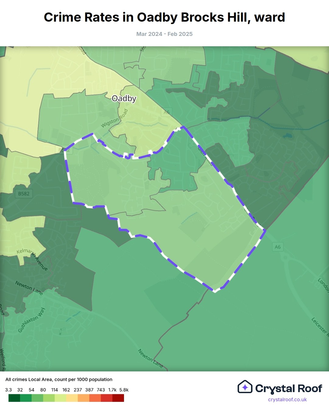 Oadby Brocks Hill, (ward) includes areas with the following crime ratings (see map):