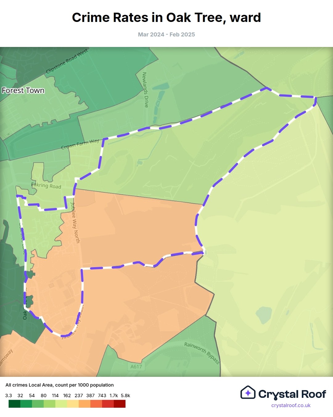 Oak Tree, (ward) includes areas with the following crime ratings (see map):
